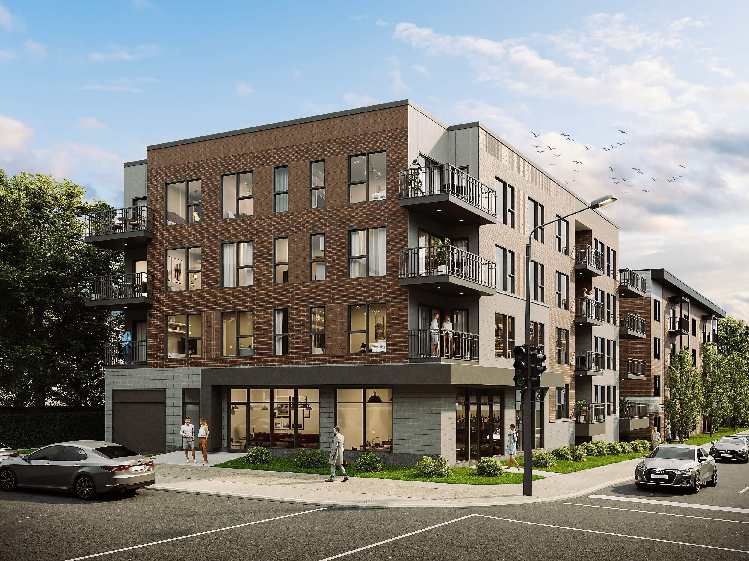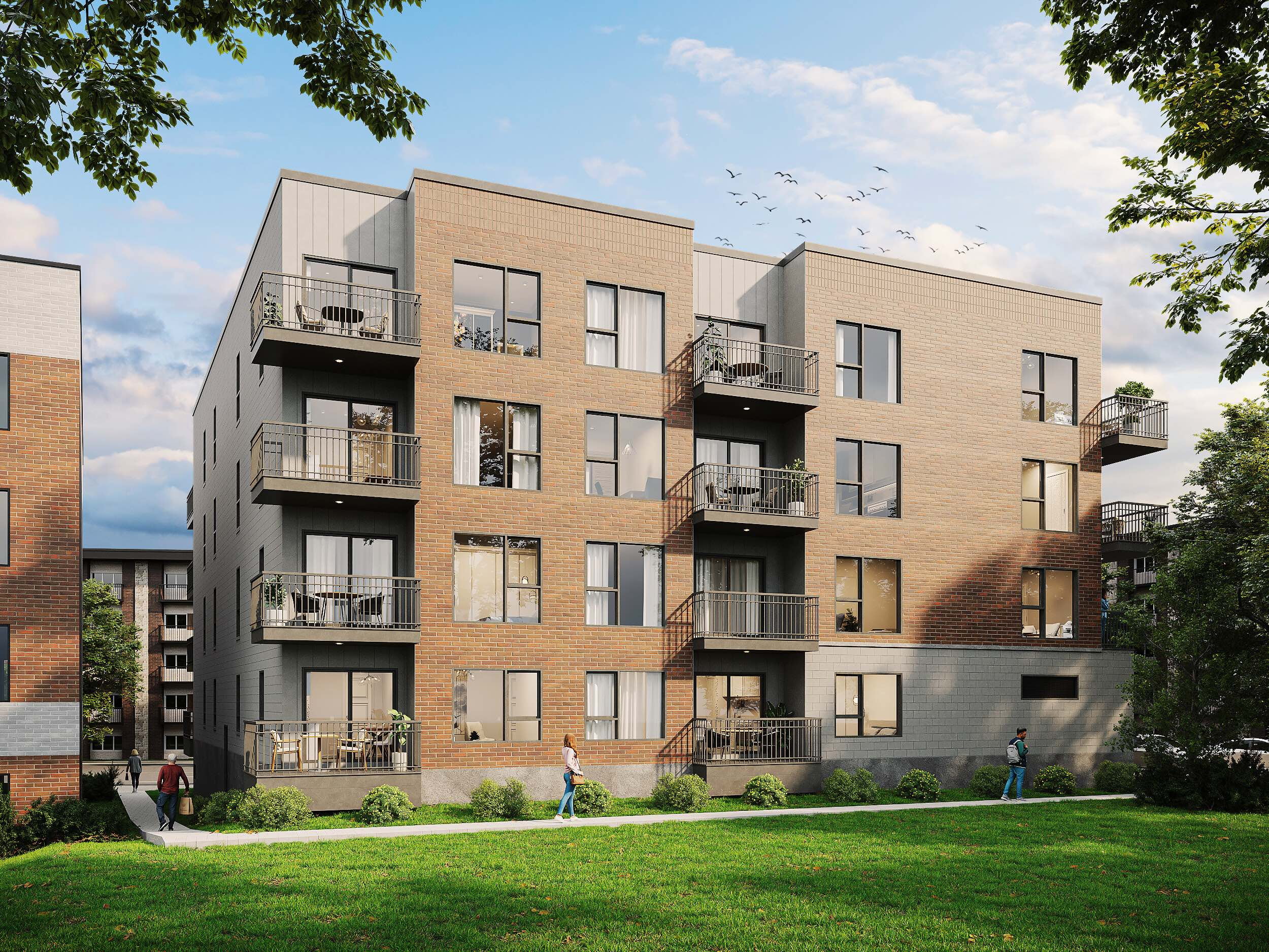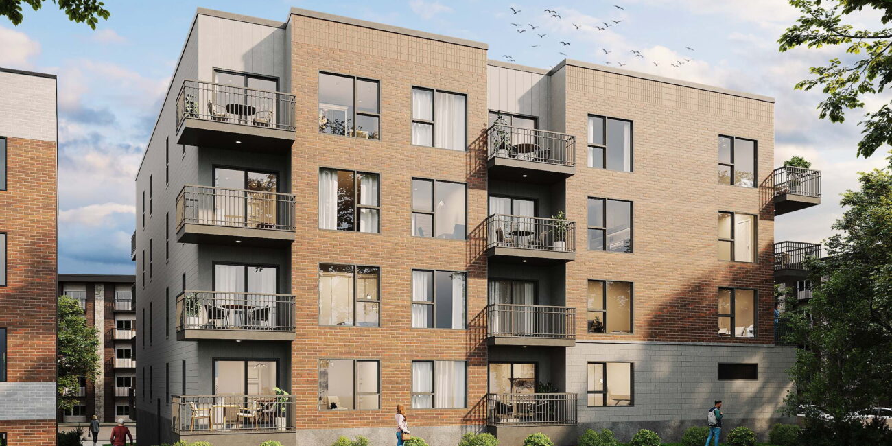 L’approche architecturale privilégie une élégance sobre et une intégration contextuelle harmonieuse. La volumétrie du bâtiment fait écho au tissu résidentiel de Cartierville : une base solide ancre le projet au niveau de la rue, tandis que les étages supérieurs se définissent par une stratification horizontale claire des matériaux.