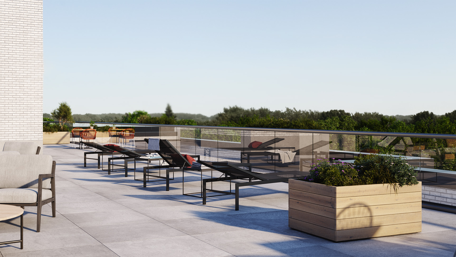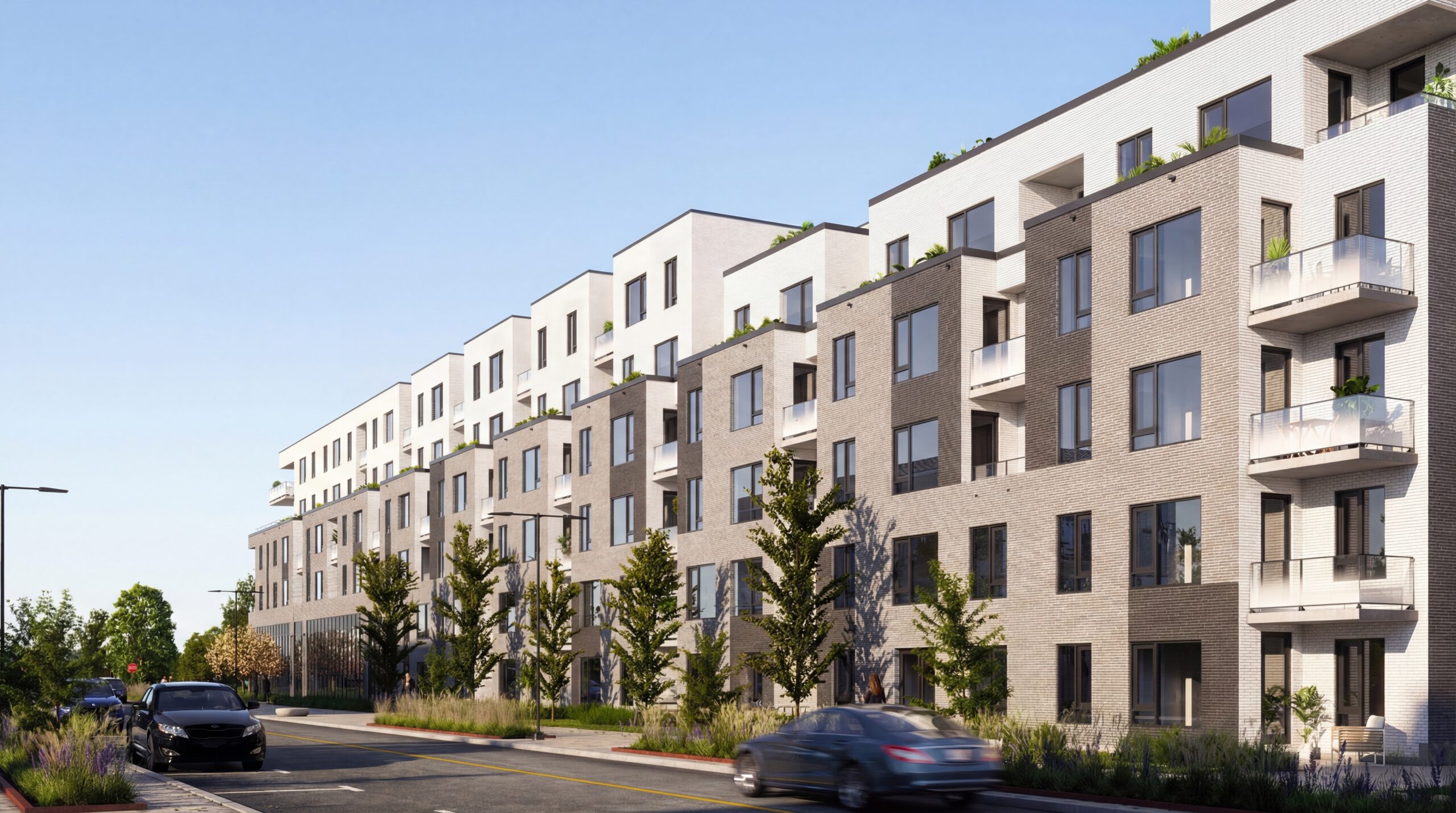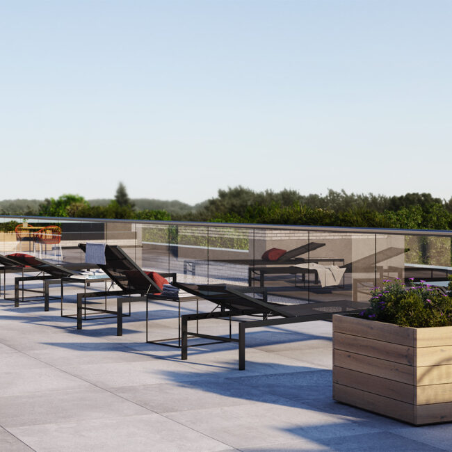Toitures vertes et terrasses : Le bâtiment est couronné de vastes systèmes de toitures végétalisées, favorisant la performance écologique et la régulation thermique. Des terrasses privées et semi-privées ponctuent les étages supérieurs, améliorant la qualité de vie et l’intérêt visuel de la structure.