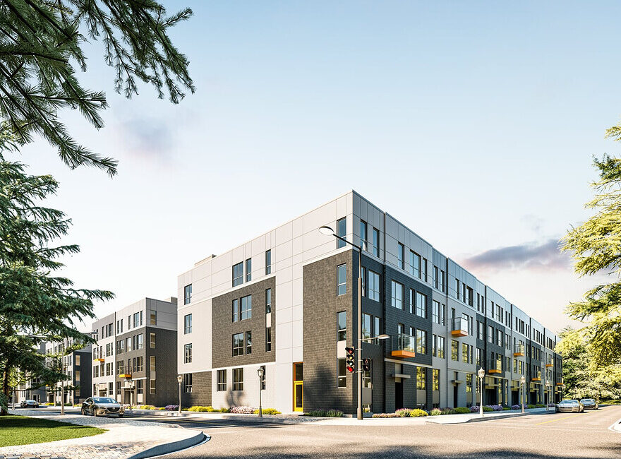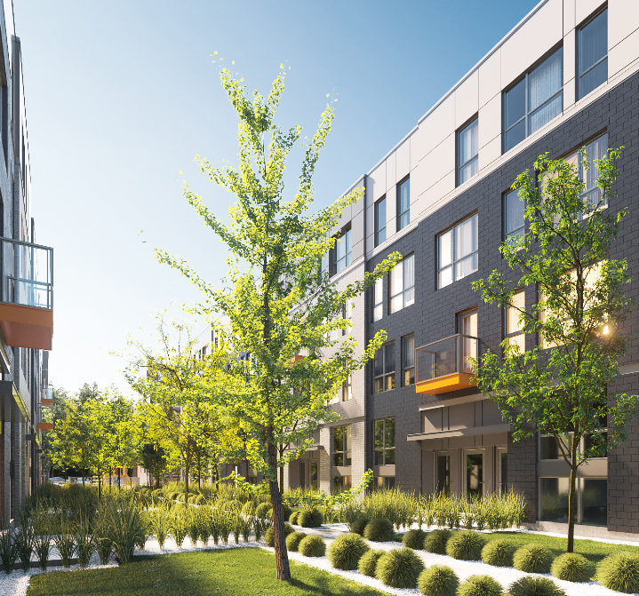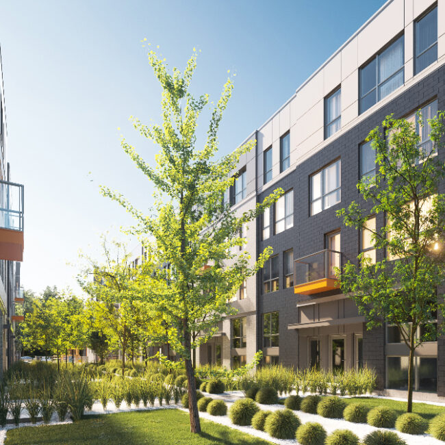 Vie durable et espaces verts: Le développement s’étend sur plus de 125 000 pi², dont plus de 20 % de la superficie est consacrée aux espaces verts, favorisant un environnement de vie écoresponsable. Les bâtiments sont disposés de manière à optimiser la lumière naturelle, à cadrer des cours verdoyantes et à favoriser un parcours piétonnier fluide à l’intérieur du site.